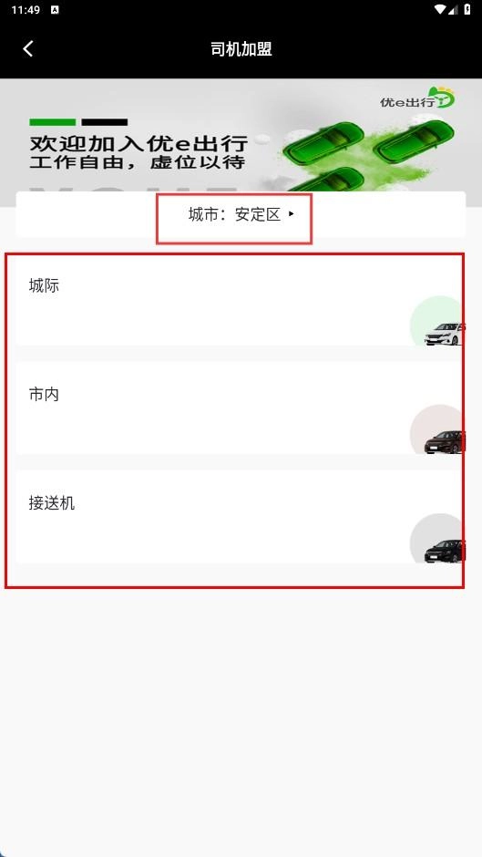 2、在司机加盟页面,选择城市和服务类型,如城际、市内、接送机。