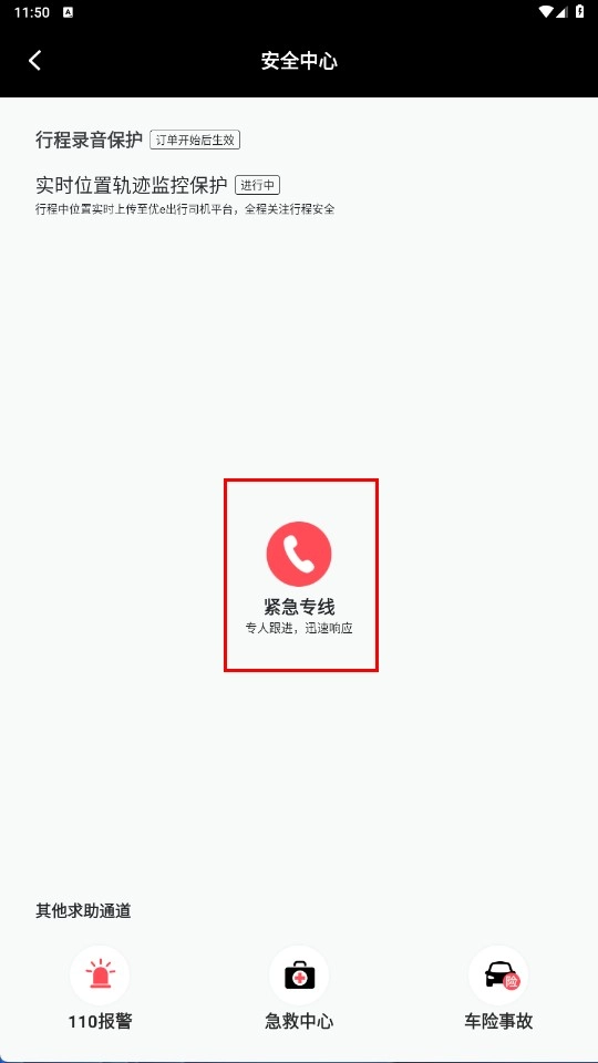 3、进入安全中心页面,可点击【紧急专线-功能按钮】,在紧急情况时求助。