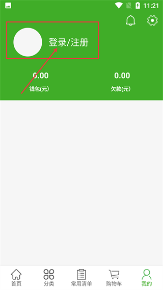 2、进入个人中心页面后,点击页面上方的【登录/注册】区域,可跳转至登录界面,该页面还显示钱包、欠款等信息模块。