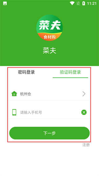 4、切换至验证码登录方式时,选定对应仓库后填写【请输入手机号】,点击【下一步】按钮即可进入验证码获取环节。