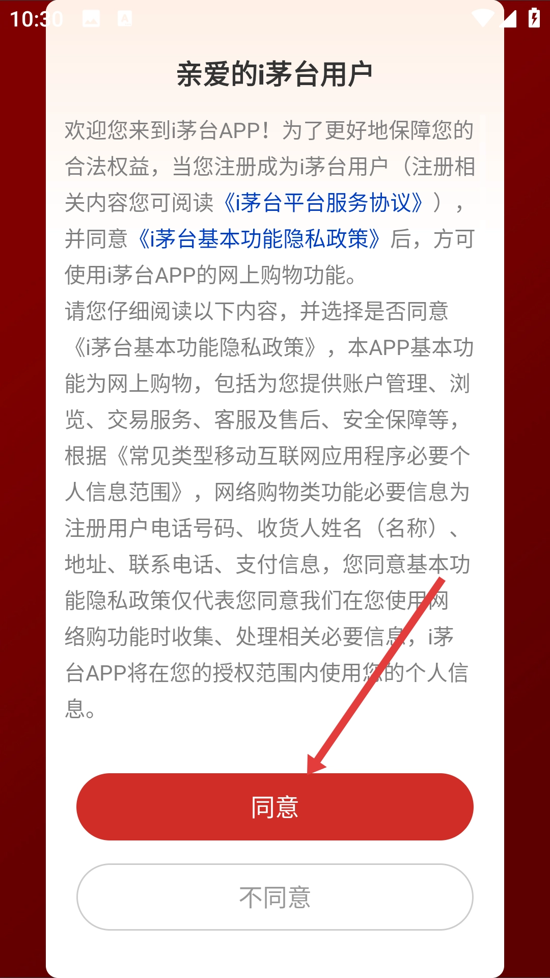 在使用i茅台之前,您需要仔细阅读《i茅台平台服务协议》与《茅台基本功能隐私政策》,并点击【同意】按钮,方可启用网上购物功能。