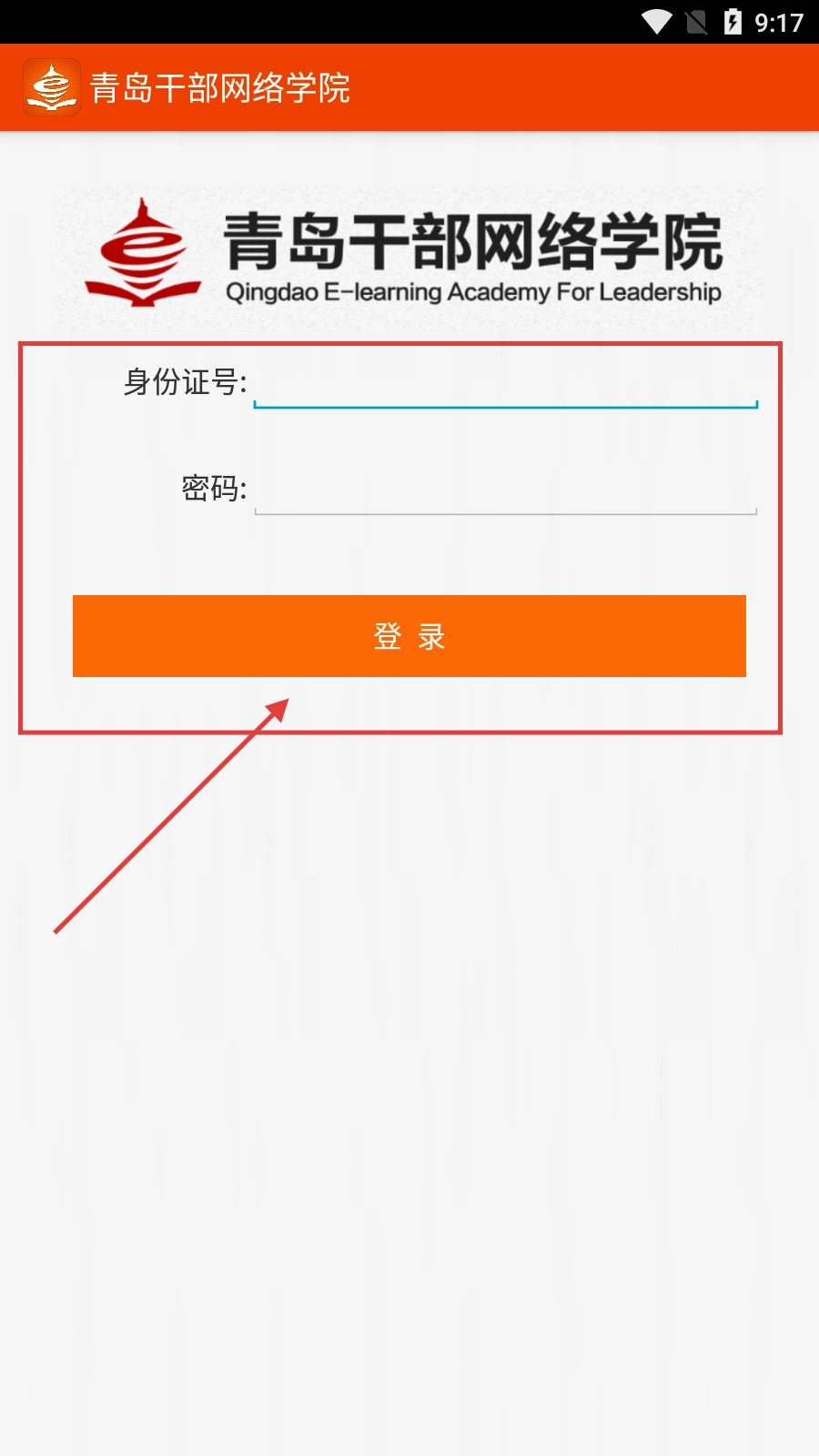 登录【青岛干部网络学院】的步骤如下:首先在【身份证号】输入框中填写对应信息,接着在【密码】输入框中输入密码,完成后点击【登录】按钮,即可进行登录尝试。
