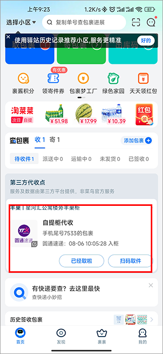 3、一键取件:无需取件码,使用菜鸟驿站扫一扫即可一键取出自提柜和驿站包裹。