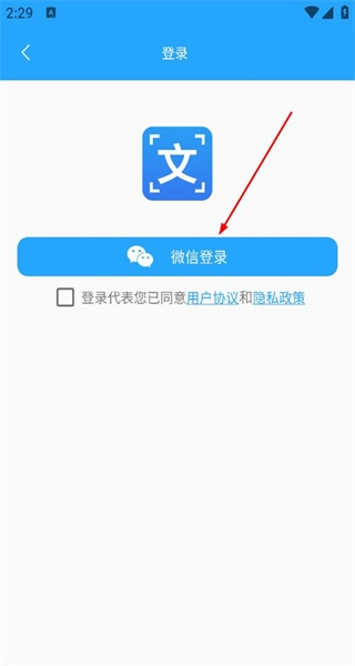 3、在登录页面勾选用户协议与隐私政策,点击微信登录按钮,完成账号登录流程。