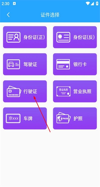 4、登录后进入证件选择界面,可挑选身份证、驾驶证、行驶证等证件类型,点击行驶证选项就能开展对应的识别操作。