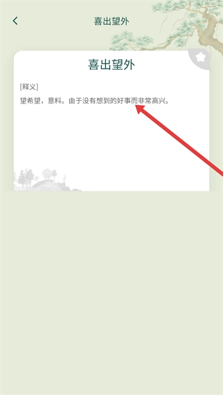 4、进入成语详情页面后,可查看【喜出望外】的释义,了解其含义为因没想到的好事而非常高兴。