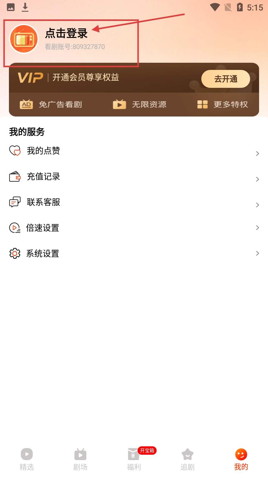 3、进入个人页面后,点击【点击登录】按钮,即可进入登录选择界面。