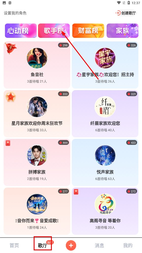 1、点击底部的【歌厅】功能按钮,进入歌厅页面后,再点击【歌手榜】分类标签。