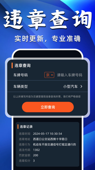 实时同步数据,覆盖全国范围的违章查询服务。您只需输入车牌号码与发动机号,就能便捷查询爱车是否存在违章记录。除此之外,我们还会提供详尽的违章信息,涵盖违章地点、违章时间、违章代码以及罚款金额等内容,助力您全面了解具体的违章行为。