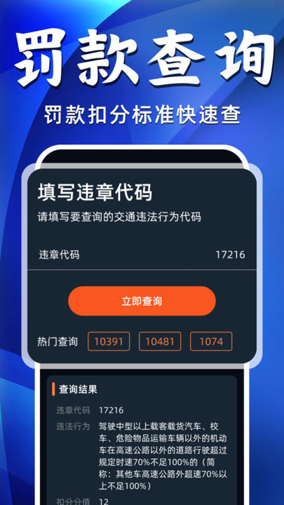 只需简单输入违章代码,就能一键查询到该代码的详细含义,其中涵盖具体的违章行为说明、扣分分值、罚款金额等内容,助力您清晰了解并掌握相关处罚规定。