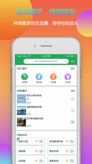 3、圈子——开放圈子:助你找到志同道合的组织,与伙伴们携手奔赴运动目标;私密圈子:为亲朋好友打造专属空间,一同运动打卡,共享健康生活。