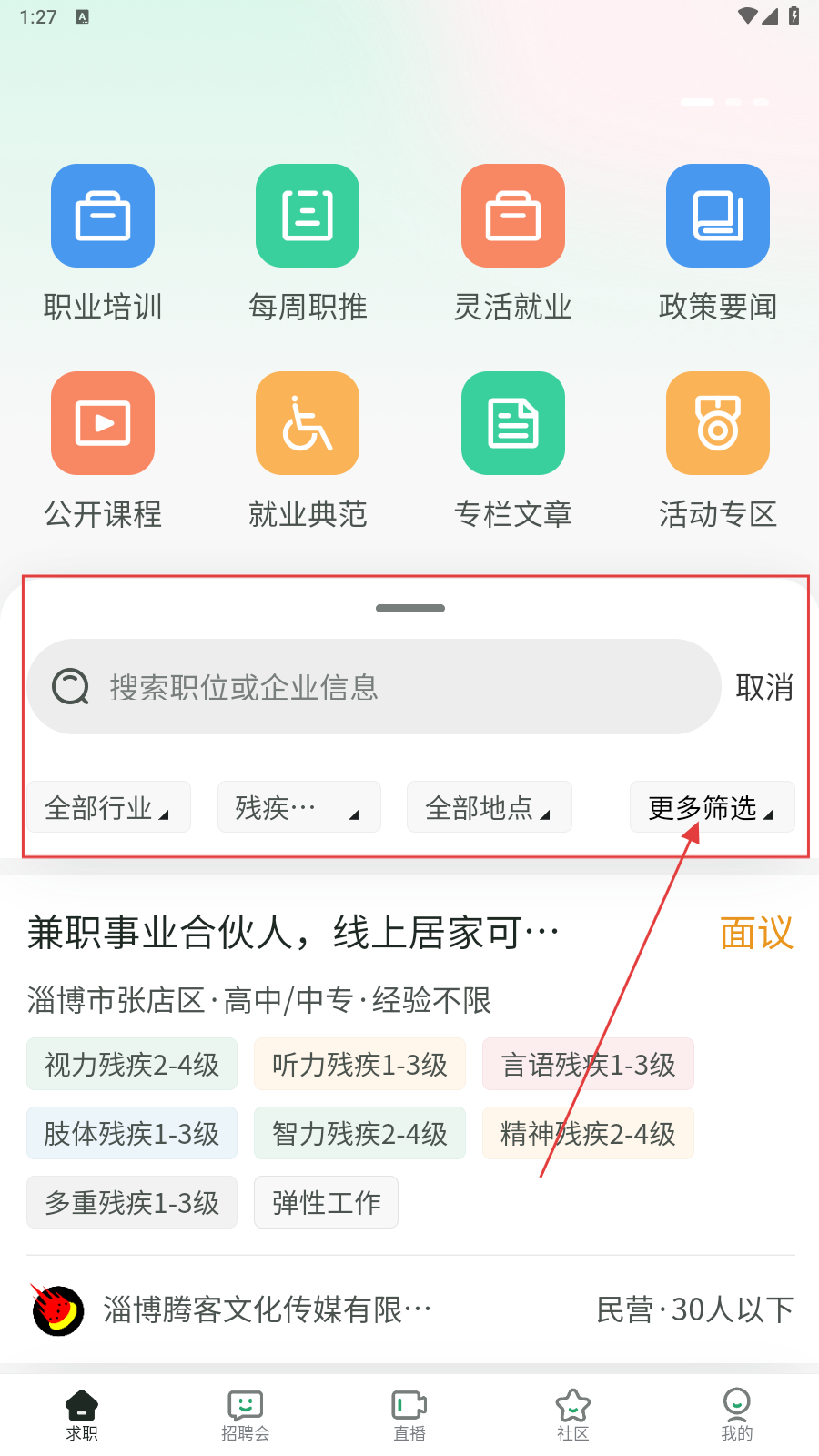 1、在求职页面,点击【更多筛选】按钮,进入筛选页面。