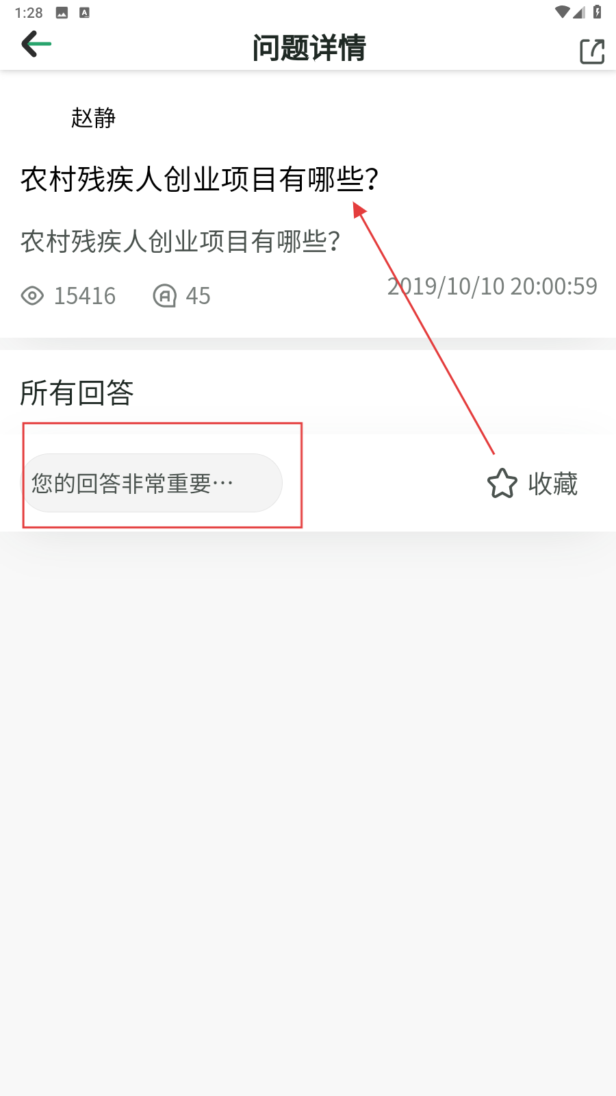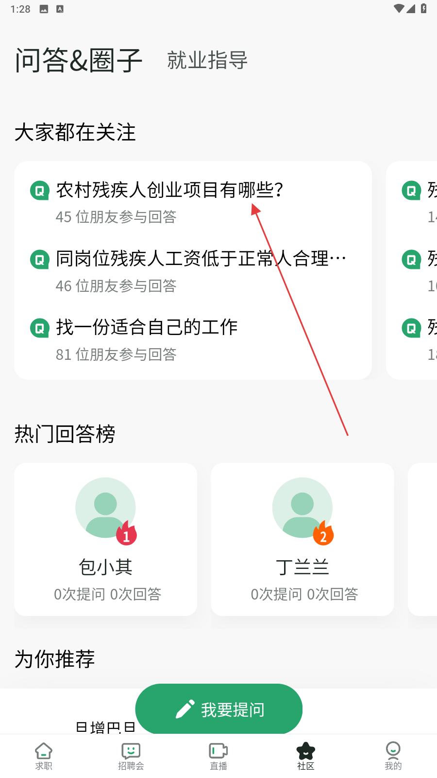 3、在社区页面,点击你所关注的问题(例如“农村残疾人创业项目有哪些?”),即可进入该问题的详情页面。