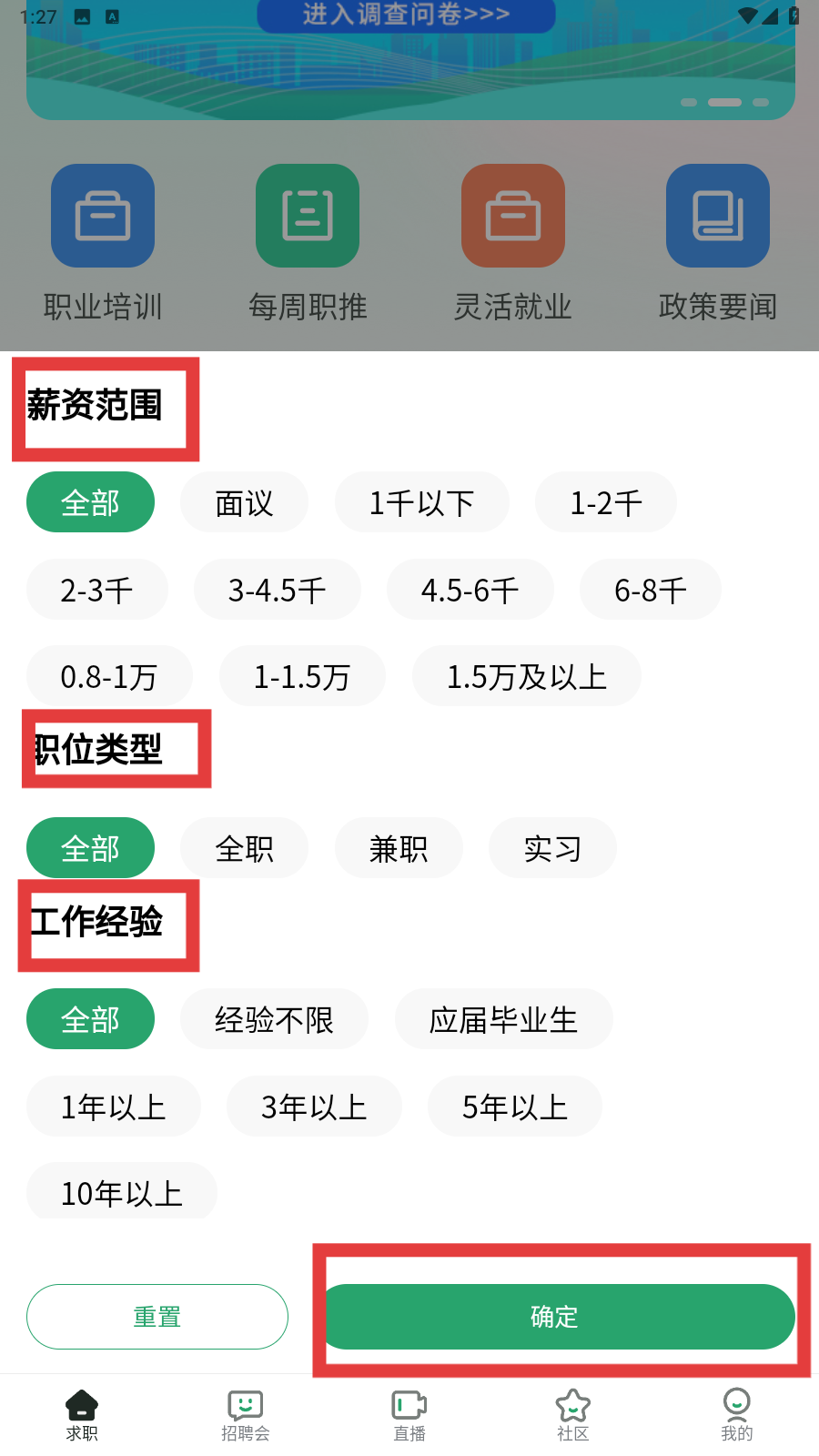 2、进入筛选页面后,选定薪资范围、职位类型、工作经验等筛选条件,再点击“确定”按钮。