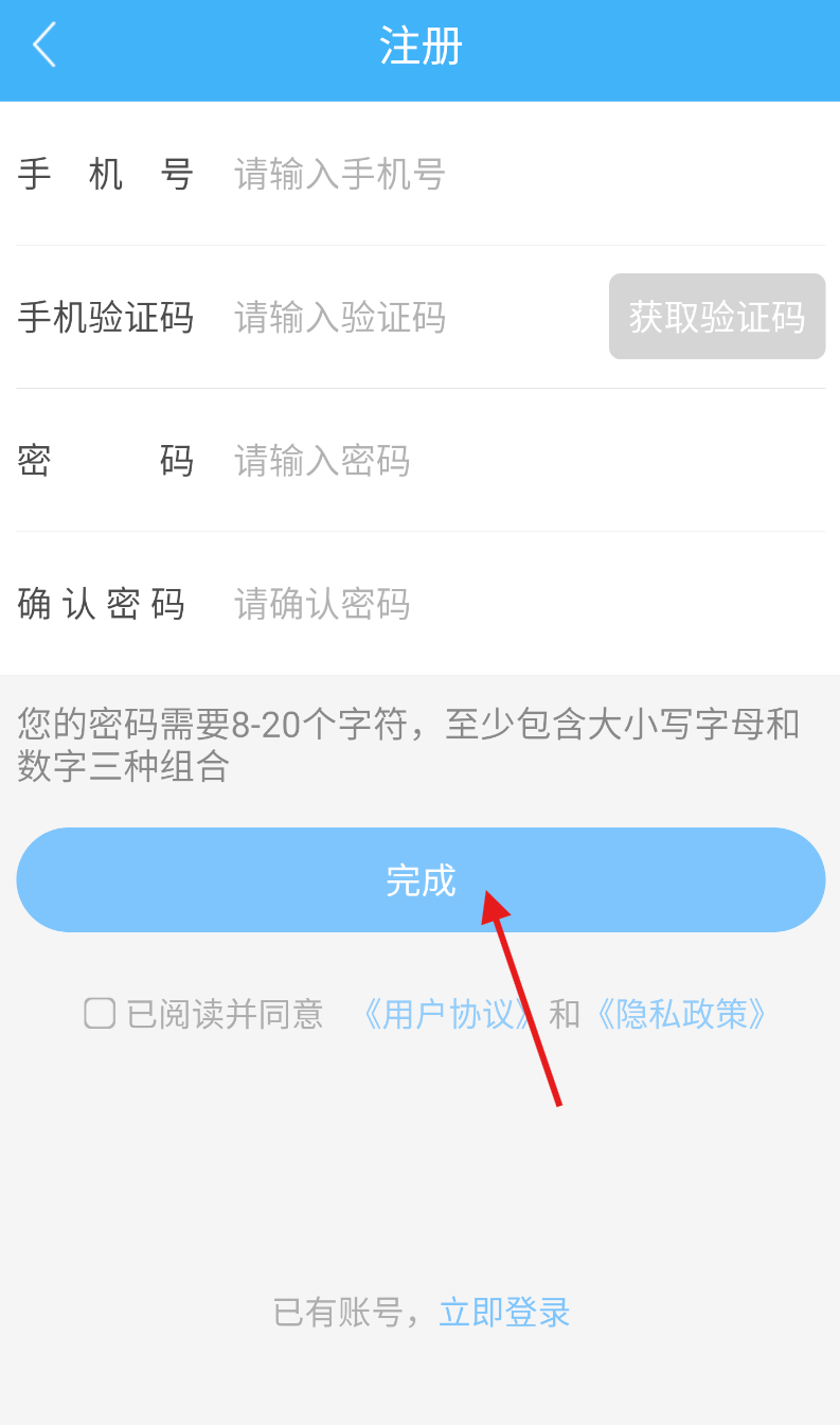 4在账号注册界面,按步骤填写手机号码,接着获取并输入验证信息,再设定登录密码,确认所有内容准确无误后点击“完成”按钮,就能顺利完成账号的注册流程。