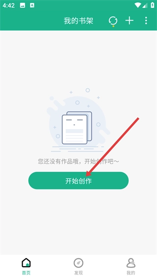 1、在【我的书架】界面,点击【开始创作】按钮,进入新建作品界面。