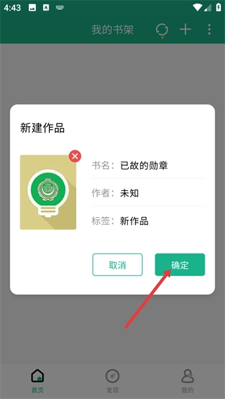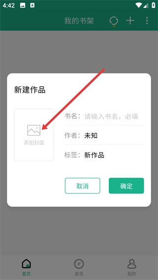 4、在新建作品界面,确认书名、作者、标签及封面后,点击【确定】按钮,完成作品新建。