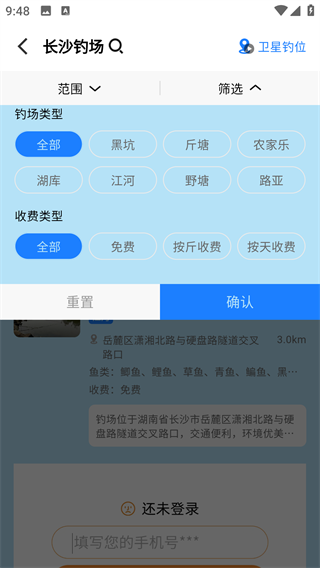 4、还能根据范围和钓场类型进行筛选,找到自己更感兴趣的钓场。