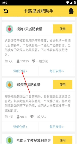 4、接着浏览软件里的减肥方法,看到模特7天减肥食谱、郑多燕减肥食谱之类的内容,然后点击查看模特7天减肥食谱的详细介绍。