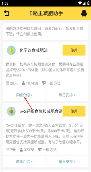 1、打开卡路里减肥助手应用,找到并点击“化学饮食减肥法”的详细介绍入口,进而查看该减肥方法的具体内容。