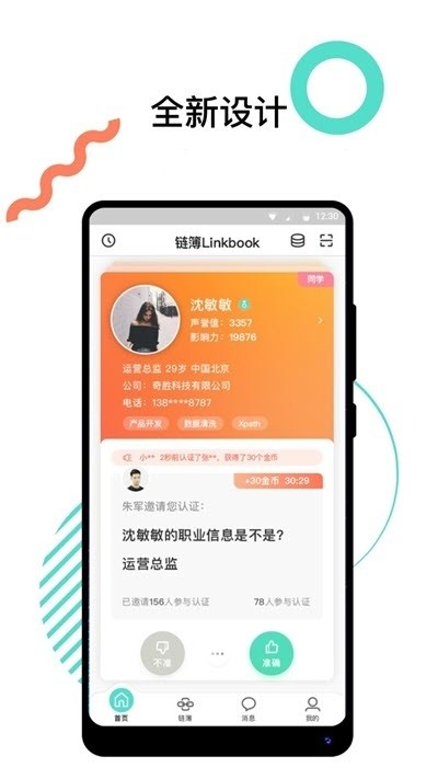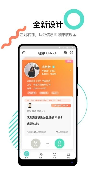 链簿是一款实用的移动服务软件,借助人工智能大数据、熟人关系认证、口碑评价与社会影响力,能帮助用户更全面地了解网络中的个体;用户也可邀请亲友协助验证自身真实性,它还是一款可通过信息认证与分享邀请获取收益的软件,融入了社交元素,依托互联网大数据让用户快速掌握陌生人的基本信息,参与个人信息认证还能获得相应奖励,轻松赚取零花钱。