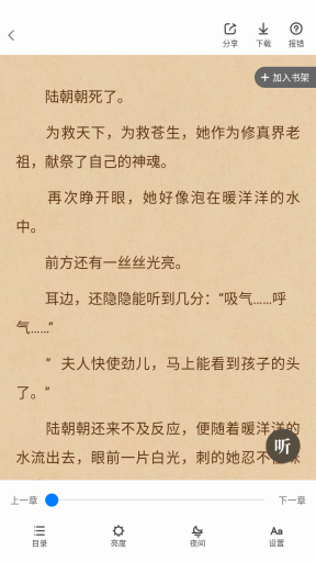 3、也能够进行个性化的阅读模式设置,调节字体大小、阅读背景、亮度等。