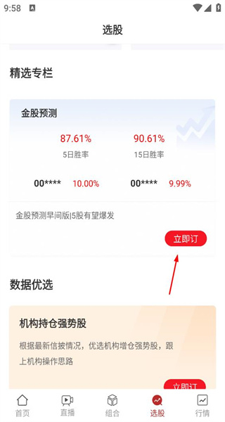 4、进入选股页面后,精选专栏会呈现金股预测相关内容,其中包含胜率等信息,点击“立即订”即可查看金股预测的详细内容。