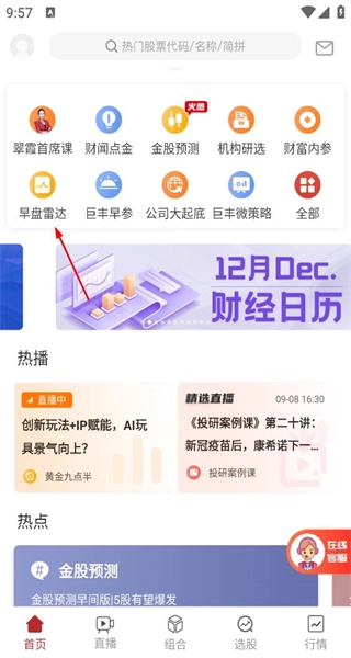 打开软件后,界面上设有搜索栏以及聚财首席等功能按钮。你可以选择“早盘雷达”功能,查看与之对应的板块信息,同时还能浏览下方的财经日历和热播直播内容。