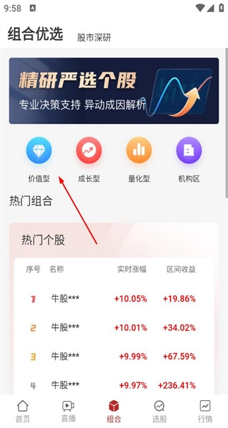 进入组合页面后,找到精研严选个股板块,从中选择成长型分类,即可查看热门组合,以及这些组合对应的个股实时涨幅和区间收益情况。