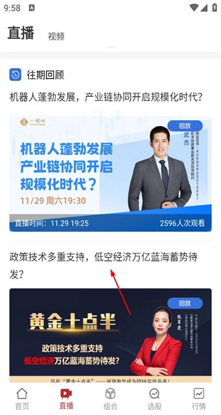 2、进入直播页面后,找到往期回顾板块查看历史直播内容,从中筛选出与低空经济主题相关的直播,点击进入即可查看该直播的回放视频以及详细信息。