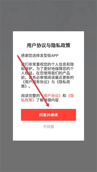 阅读《用户服务协议》与《隐私政策》的内容后,点击“同意并继续”按钮,即可进入应用的后续界面。
