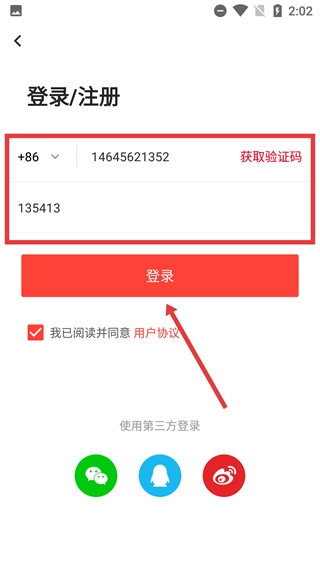 3、进入登录/注册界面后,依次填写手机号、获取并输入验证码,勾选同意相关协议,随后点击“登录”按钮,即可完成账号登录操作。