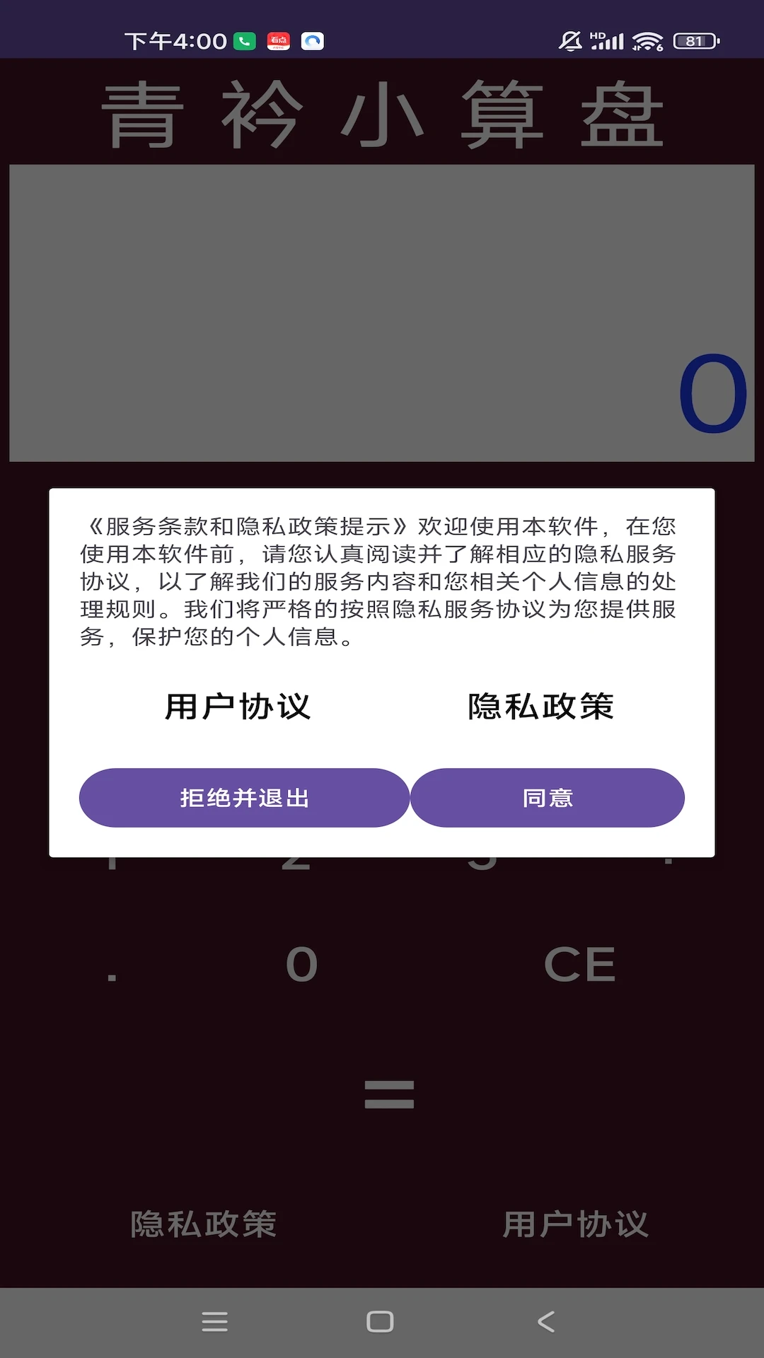 1、打开计算器应用,默认显示初始值(如“0”),可通过数字键输入运算数字。