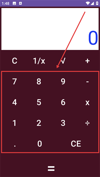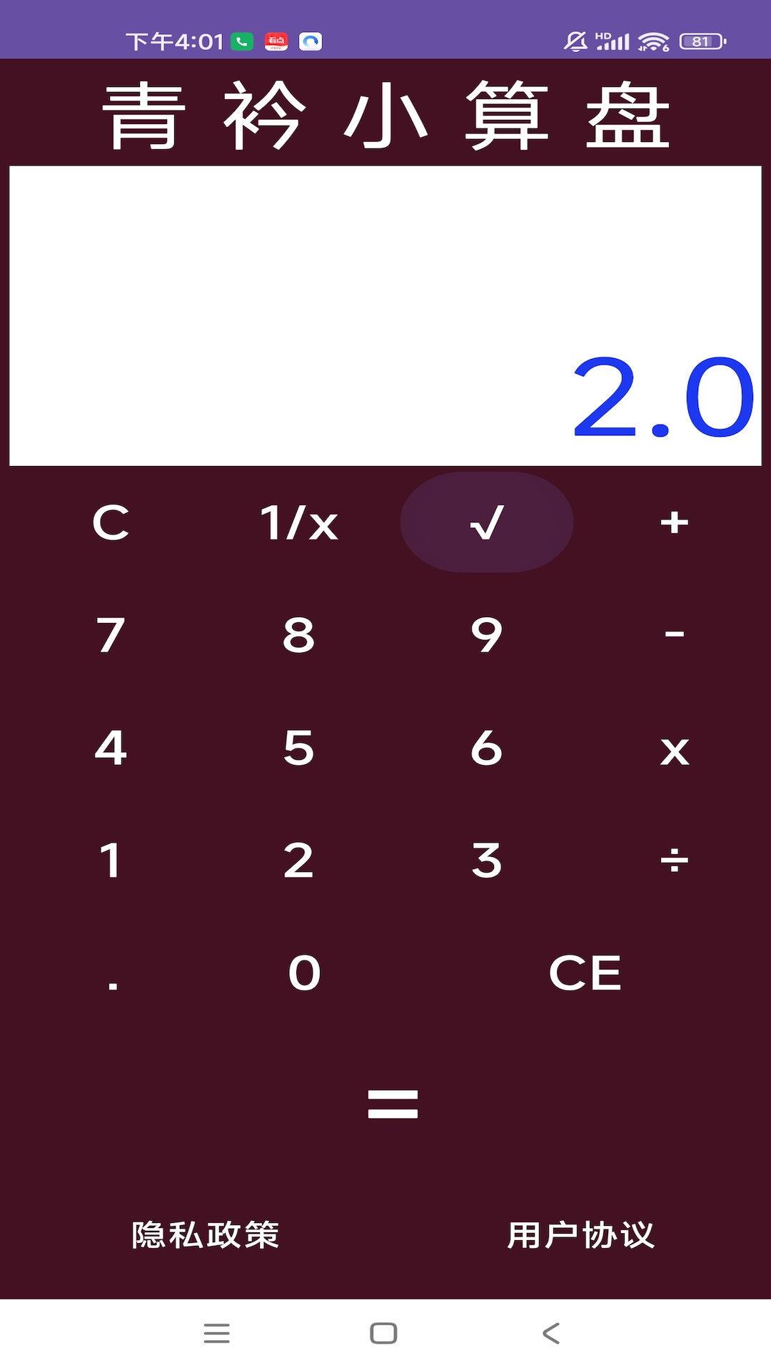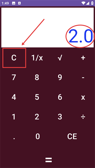 3、点击【=】按钮,计算器自动计算并显示结果(如“2.0”)。