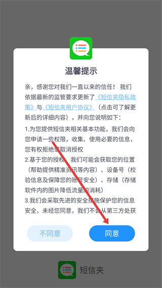 1、阅读《短信夹隐私政策》《短信夹用户协议》对应的温馨提示内容后,点击弹窗中的【同意】按钮,进入短信夹应用界面。