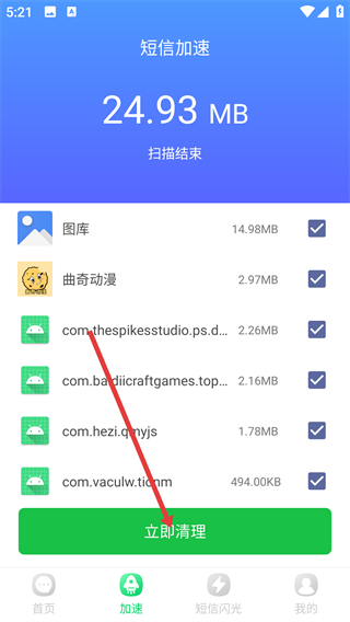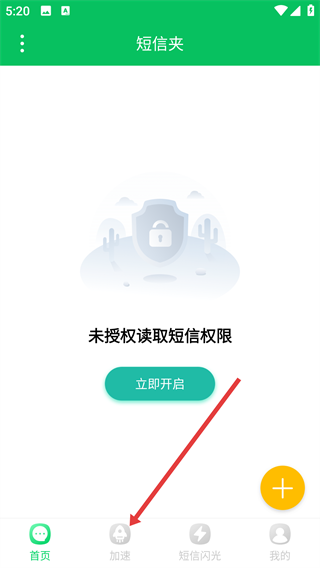 2、在短信夹首页底部功能栏,点击【加速】选项,进入短信加速的垃圾扫描页面。