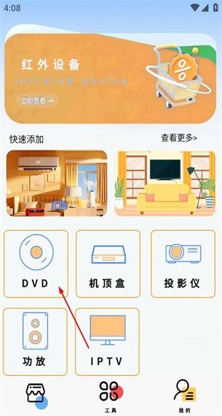 打开软件进入首页后,找到并查看红外设备相关选项,点击其中的DVD选项,即可进入选择DVD品牌的页面。