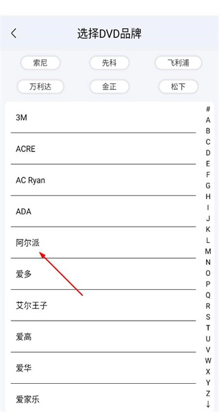 2、进入DVD品牌选择页面后,浏览所展示的品牌列表,从中选定阿尔派品牌,以此完成DVD设备的品牌选择操作。
