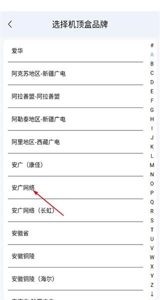 3、选择机顶盒选项进入对应的品牌页面,浏览品牌相关内容后,选中安广网络品牌,继续推进机顶盒设备的添加流程。