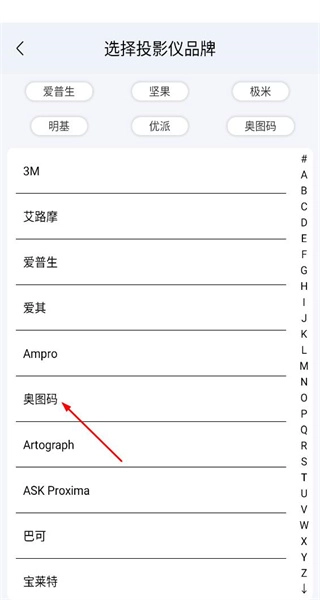 4、点击投影仪选项进入对应品牌页面,浏览品牌列表后,选择奥图码品牌,接着进行投影仪设备的添加流程。