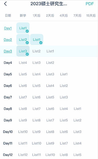 学习计划清单里,每一天的单词学习都包含记忆与复习两个环节,只有完成当天的记忆和复习任务,方可开启下一天的学习。勾选标记意味着该部分(记忆或复习)已完成。就像图中所示,Day3已经完成了list3的记忆,但还需要复习list1和list2,之后才能进入Day4的学习阶段。