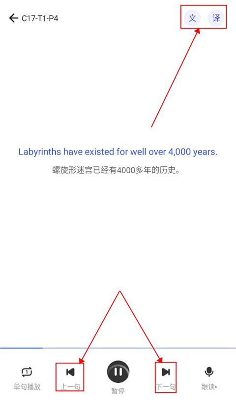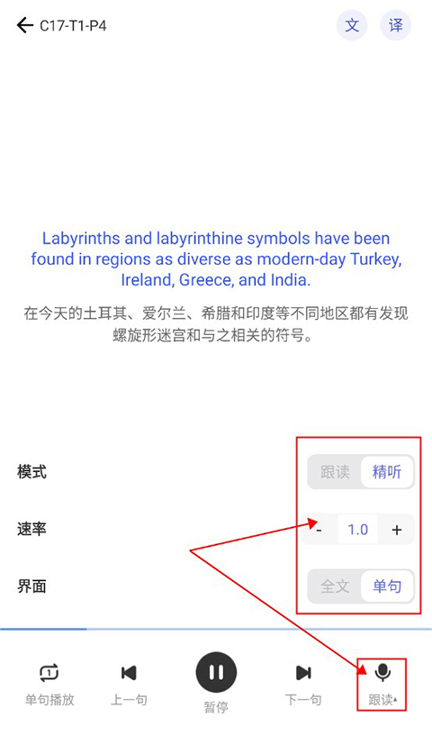 用户进入跟读页面后,可在右上方设置英文显示与翻译功能。开启后,页面会呈现英文内容及对应的中文翻译;点击下方的播放按钮,系统便会自动播放音频,用户只需跟随朗读即可。此外,页面左右两侧设有句子切换按钮,便于用户回顾已读内容或加快跟读进度。