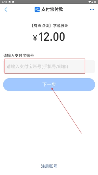 4、进入支付宝付款界面后,填写对应的支付宝账号(支持手机号或邮箱格式),接着点击【下一步】按钮,即可完成后续的支付流程。