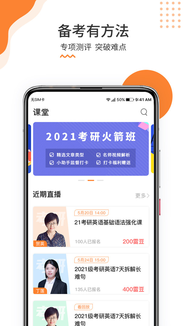 3、点击进入课堂页面后,就能查看近期的直播内容,还可以挑选课程开展学习。