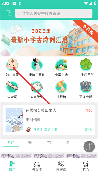 进入首页后,能够借助搜索栏查找古诗,也可以点击【幼儿启蒙】之类的分类入口,查看像【逢雪宿芙蓉山主人】这样的古诗内容。