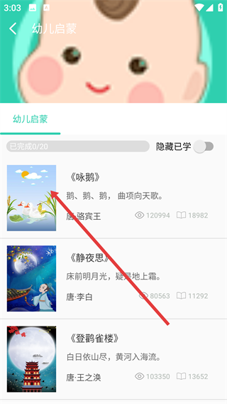 2、进入【幼儿启蒙】页面后,查看标注为【已完成-5/20】的学习进度,点击类似【《咏鹅》】这样的古诗条目,即可进入对应的内容页面。