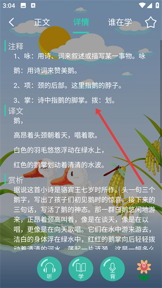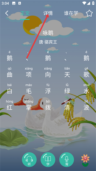 3、进入《咏鹅》正文页后,查看带有拼音标注的诗句内容,可借助页面下方的【听】【学】等功能按钮,辅助完成这首古诗的学习。