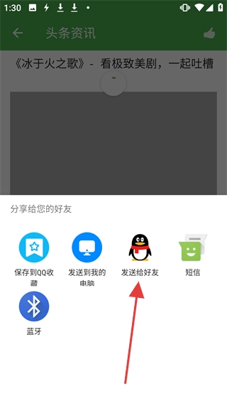 4、在分享界面点击【发送给好友】,可将资讯分享给QQ好友。