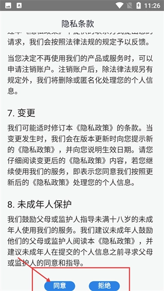 1、仔细阅读【隐私条款】,了解其中关于变更规则、未成年人保护等相关内容后,点击【同意】按钮,就能进入应用的主界面。