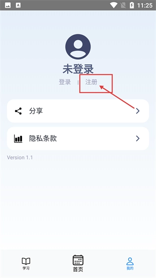 3、在显示“未登录”状态的“我的”页面中,点击【注册】按钮,即可进入账号注册的操作界面。